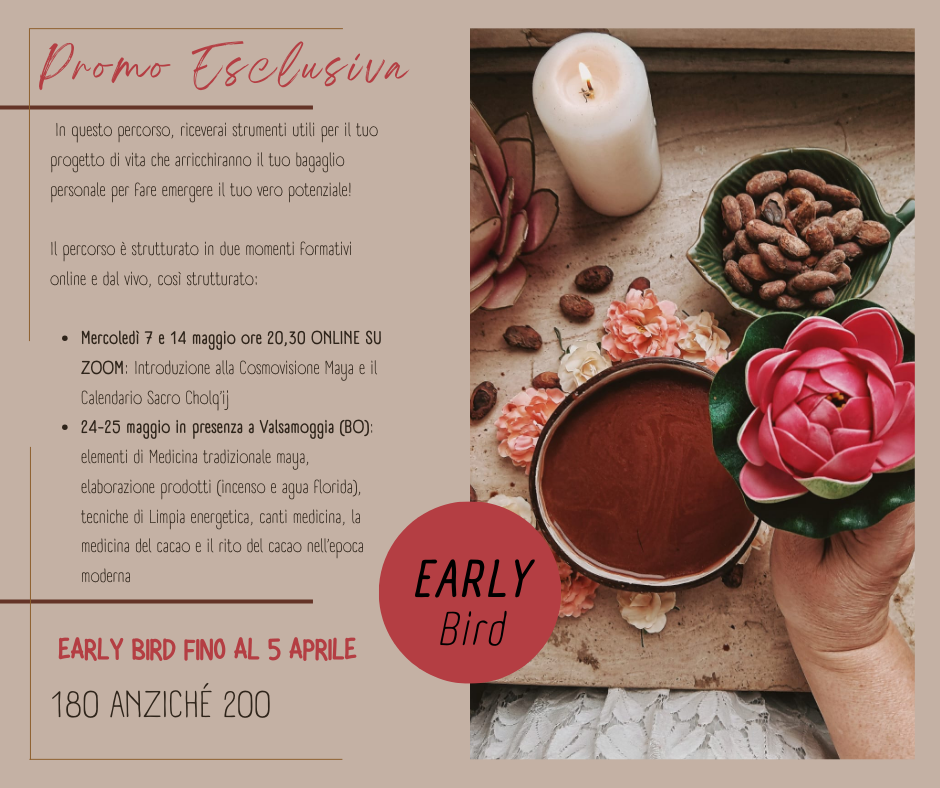 • 24-25 maggio in presenza a Valsamoggia (BO): elementi di Medicina tradizionale maya, elaborazione prodotti (incenso e agua florida), tecniche di Limpia energetica, canti medicina, la medicina del cacao e il rito del cacao nell’epoca moderna